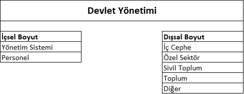 Devlet yönetiminin başarılı olması için yalnızca yönetim sisteminin ve bu sistemi uygulayan kadroların başarılı olması yetmez. Devlet yönetimi, içsel ve dışsal boyutları bulunan bir yönetim alanıdır. Bu yönüyle gerek sivil toplumdan, gerek özel sektörden gerekse diğer alanların yönetimlerinden farklılık gösterir.